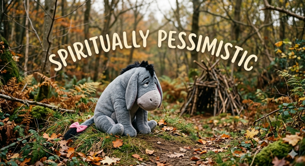 Most people wouldn’t identify themselves with Eeyore, but have you ever caught yourself reading through the Bible and only applying the negative things to your life? Are you spiritually pessimistic while reading the judgments, curses and rebukes and automatically take that to heart like that’s for you personally. Why, why do you skim over the love God has for you and go directly to the negative? It says in Romans 8:1 KJV There is therefore now no condemnation to them which are in Christ Jesus, who walk not after the flesh, but after the Spirit.