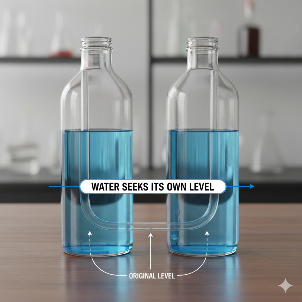 Imagine you have two bottles of water connected by a straw at the bottom. If you pour water into just one bottle, it won’t stay high in that bottle while the other stays empty. Instead, gravity pulls it down until it flows through the straw and rises in both bottles until they are at the exact same height. In physics, this is called hydrostatic equilibrium. Because water can flow freely, it will always move from a place of high pressure to low pressure until everything is equal.